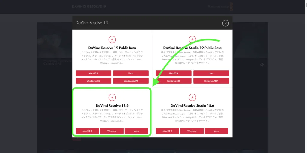 左下の「DaVinci Resolve 18.6」の「Windows」ボタンをクリックして下さい