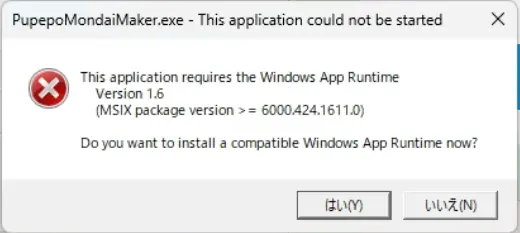 こちらのエラーはWindows App Runtime1.6がパソコンにインストールされていない場合に起こります。
