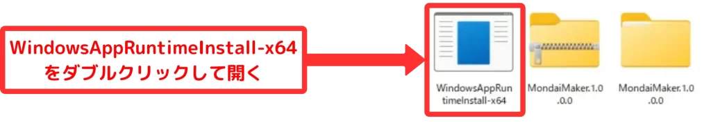 ダウンロードすると、WindowsAppRuntimeInstall-x64というファイルがダウンロードされるので、開いてください。